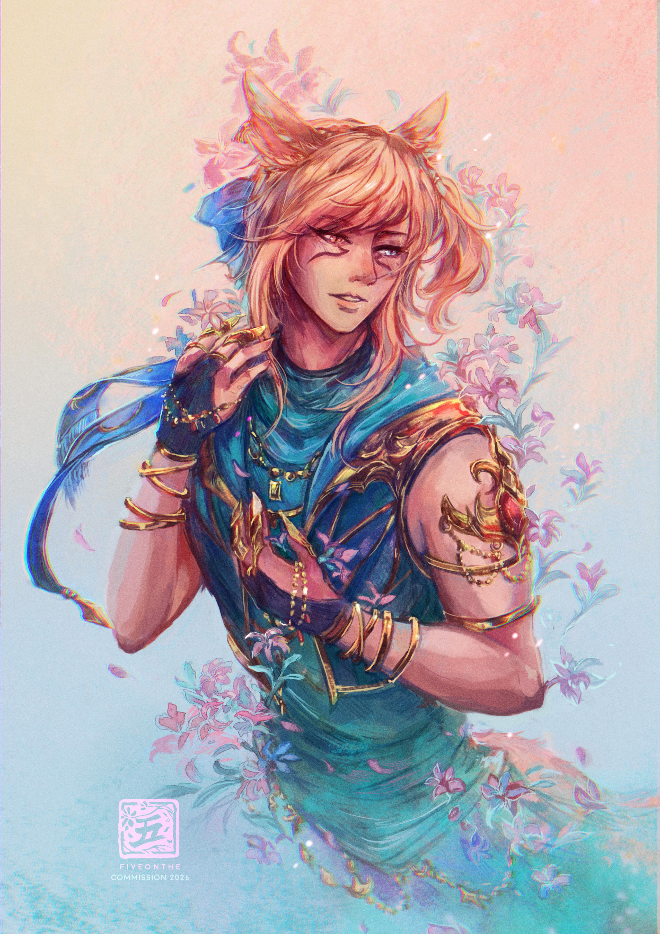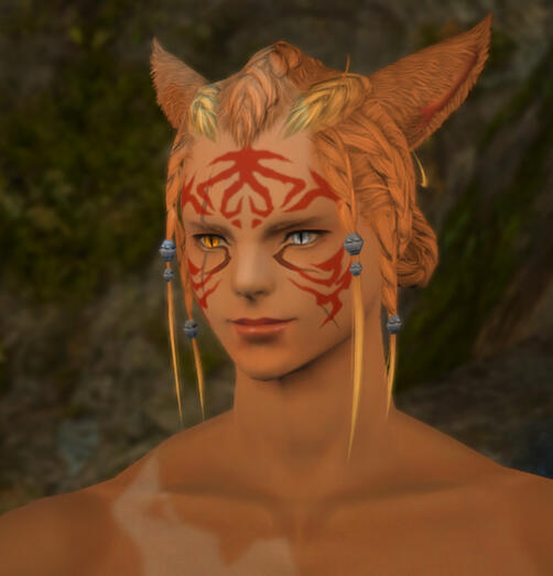 I'ason is a smaller than average male miqo'te. Lightly tanned, he is limber and athletic despite his soft appearance, and stronger than he looks thanks to his main means of livelihood as a hunter-gatherer. Nowhere near the strength of actual combatants, however, I'ason is a man who relies more on agility, dexterity, and his cardiovascular fitness than brute force. His hands may be notable as 'piano hands,' with long, slim fingers suited for dexterous tasks.His hair is a sun-kissed blonde with rolanberry tips, which gives him the resemblance of a peach. He exhibits heterochromia, with his left eye being a silver-grey and his right eye being a rich amber. His tail is unremarkable, of the same peach coloration as his hair, and tipped with pink.Style-wise, I'ason does his best to look good and tasteful. He largely avoids baring skin, preferring instead to wrap himself up in pleasing silhouettes and pretty fashion. When traversing the desert, his dress is largely loose-fitting and protective against the harsh rays of the sun, though in other hot climes less harsh than the Sagolii (such as La Noscean summers), he will bare some skin for the sake of temperature regulation. He has an eye for Ishgardian and Thavnairian or Hannish styles. However, when it comes to having to choose between form or function, I'ason does have the good sense to prioritize function. That doesn't mean, however, that he won't try to marry both.